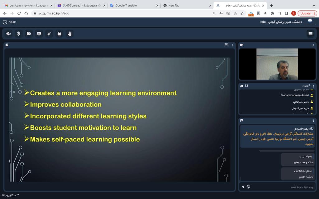 به گزارش روابط عمومی معاونت آموزشی دانشگاه علوم پزشکی گیلان؛ در راستای برنامه جامع عدالت ، تعالی و بهره وری در آموزش علوم پزشکی ، مرکز مطالعات دانشگاه همکاری کارگروه توسعه آموزش و فناوری های نوین ارتقای یادگیری وبینار آموزشی با موضوع Technology Enhanced Learning را روز دوشنبه 14 شهریور ماه سالجاری ویژه اعضای هیئت علمی برگزار نمود. در این وبینار که با سخنرانی دکتر علی حمیدی مدنی (عضو هیئت علمی دانشگاه و مدیر کارگروه توسعه آموزش و فناوری های نوین ارتقای یادگیری) آغاز و سپس با ارائه دکتر ماندانا شیرازی (عضو هیئت علمی دانشگاه علوم پزشکی تهران) و دکتر علیرضا میرباقری (عضو هیئت علمی دانشگاه علوم پزشکی تهران) ادامه یافت، در زمینه ساختار برنامه جامع عدالت ، تعالی و بهره وری در آموزش علوم پزشکی، شبیه سازها، کاربرد و انواع آنها و... صحبت شد.