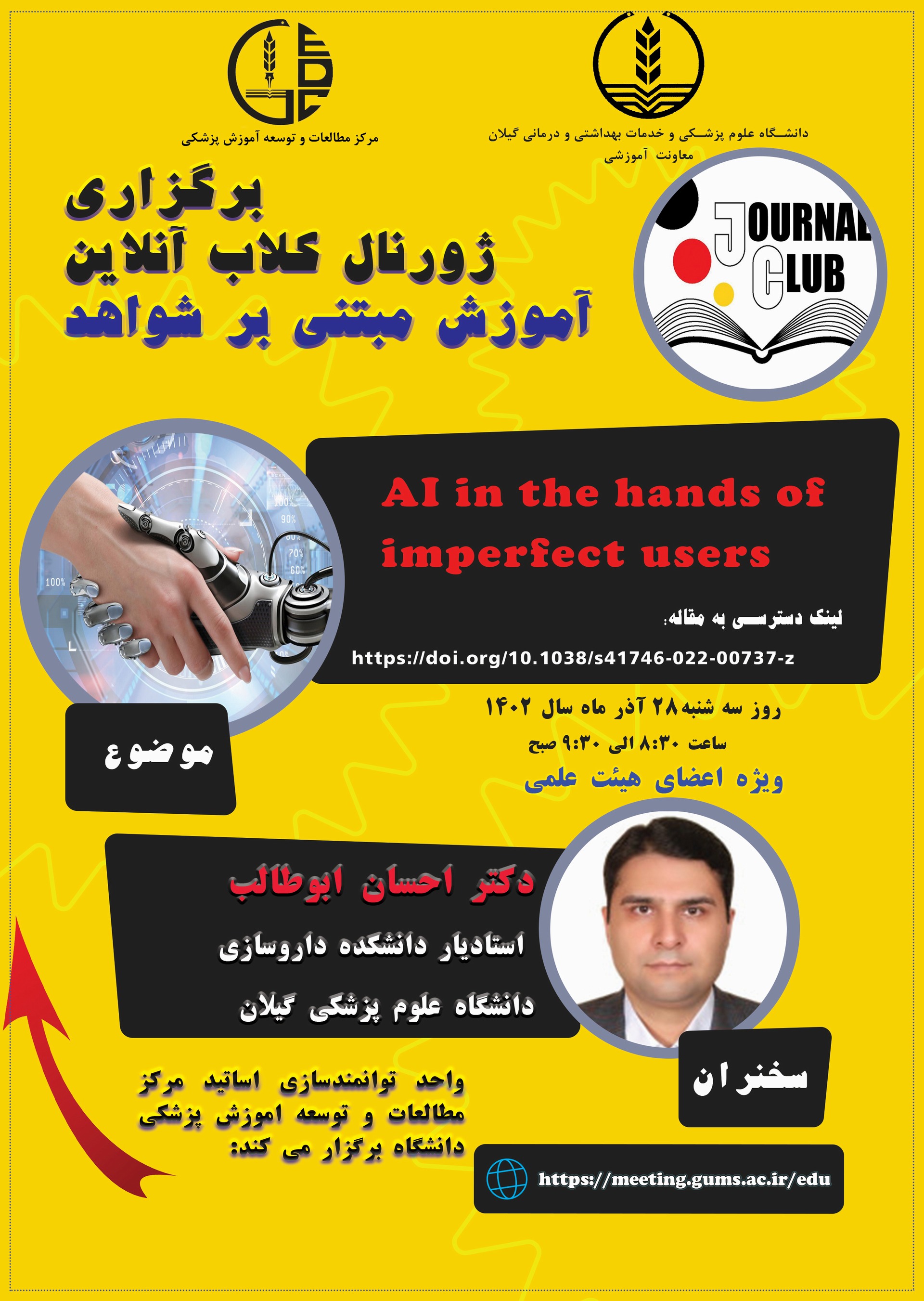 مرکز مطالعات و توسعه آموزش پزشکی دانشگاه در نظر دارد  ژورنال کلاب آنلاین آموزش مبتنی بر شواهد، باعنوان: " AI in the hands of imperfect users  "  را با سخنرانی آقای دکتر احسان ابوطالب  (عضو محترم هیئت علمی دانشگاه)" ، روزسه شنبه ، مورخ 28 آذر ماه1402 از ساعت 08:300 الی 09:300صبح ویژه اعضای محترم هیئت علمی برگزار نماید .