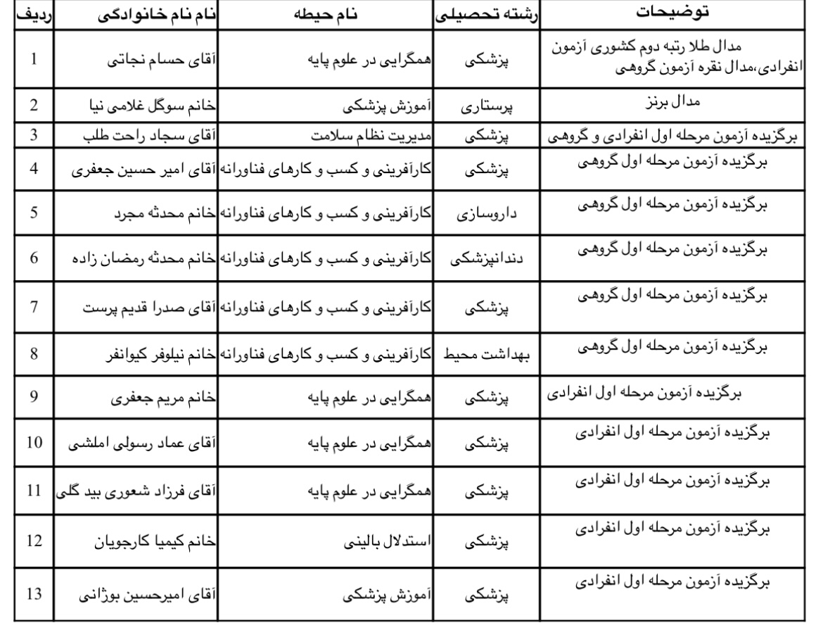 اسامی دانشجویان افتخار آفرین شانزدهمین المپیاد علمی دانشگاه به شرح ذیل می باشد: